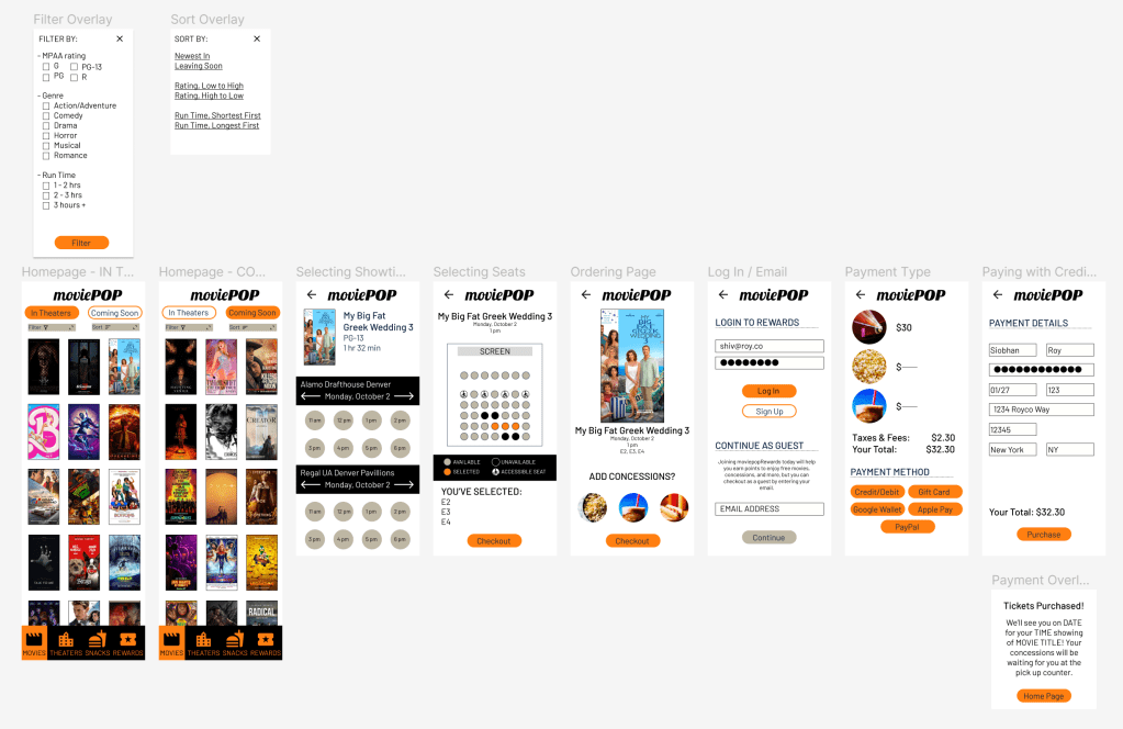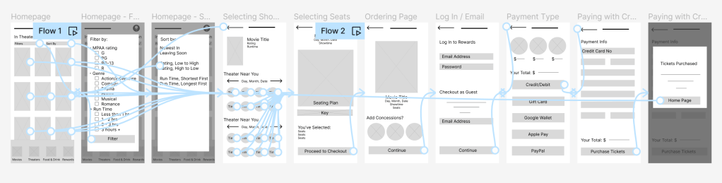 For each page of my initial design – the homepage, filters menu, ordering, selecting seats, and payment – I created five paper wireframes, selecting the best elements of each to build a starting design. This process helped to focus on the most important elements of the design – the movie ticketing function, as well as the enhanced filtering.