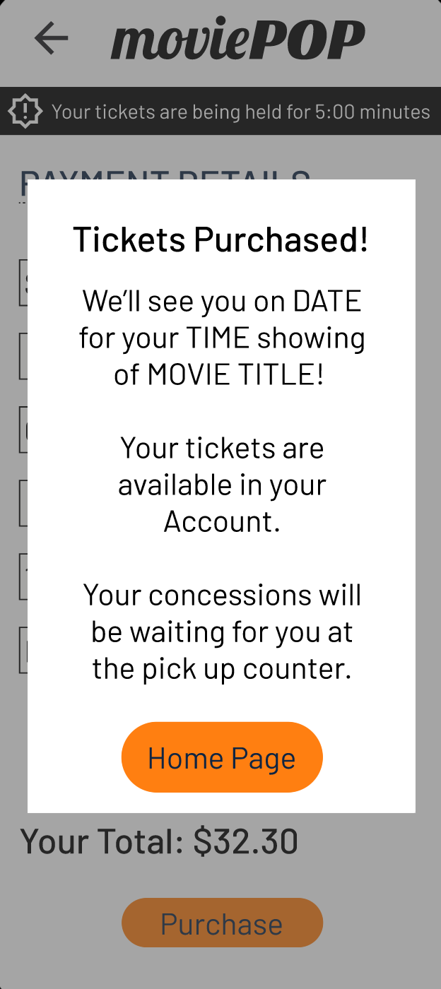 SOLUTION: A note about tickets being available in the Account was added to the purchase confirmation overlay. In addition, the lower menu was updated to have an Account tab instead of Rewards, to support this update. In addition, a timer alert was added to each step of the checkout process.