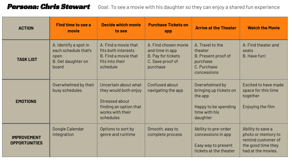 These concerns were reflected in our user personas, including the following for Chris Stewart. Chris is a busy, working, single dad who needs to find a movie that fits both his and his daughter’s busy schedule because their time for leisure activities together is limited.